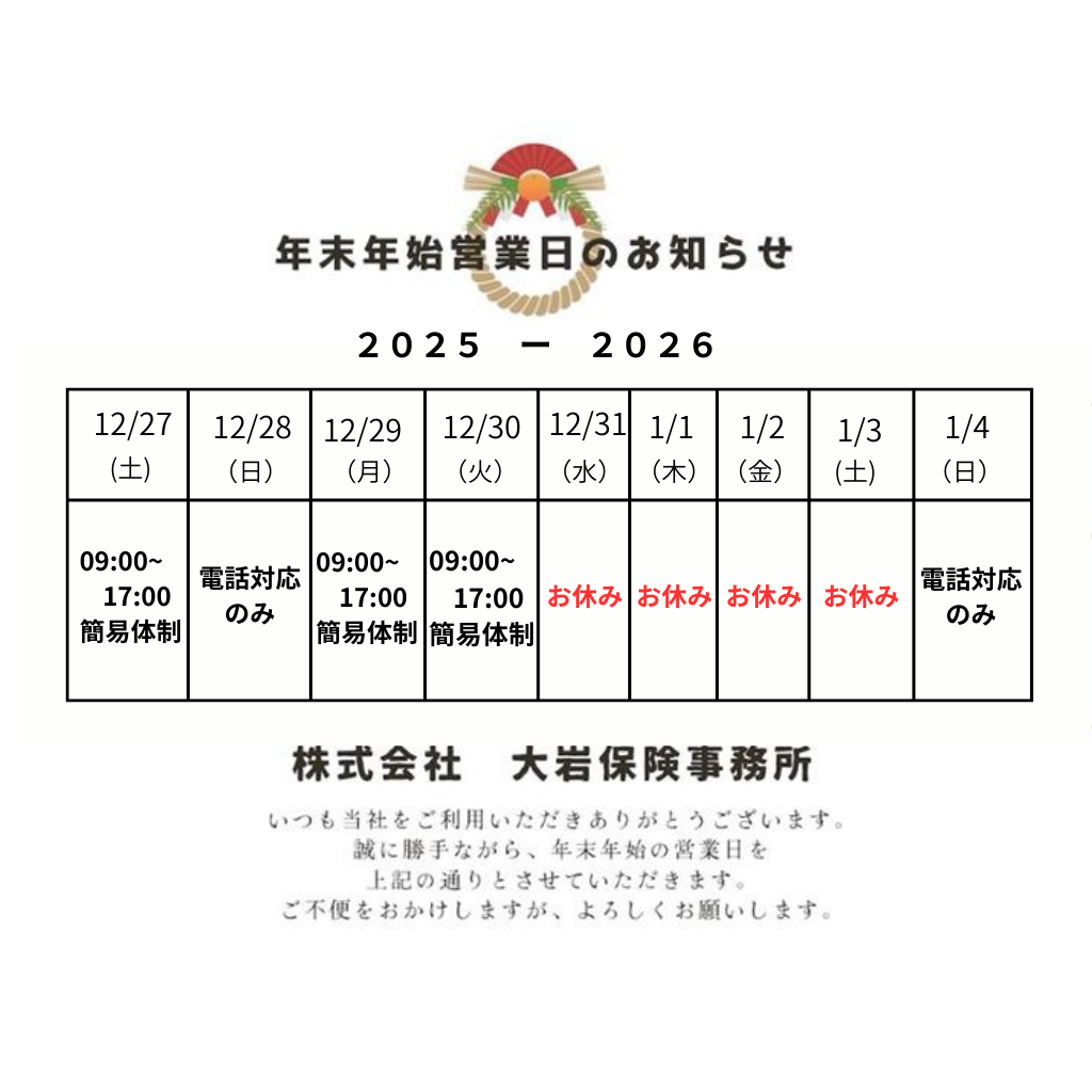 2025年12月23日 / 最終更新日時 : 2025年12月23日 ymochi@ohiwains.com 年末年始のお知らせ 皆様お世話になります🙇♂️ 年末年始営業日のお知らせです🙇♂️ 弊社休業日などの事故については、 公式LINEのメニューより各保険会社のロードアシストなどに電話できるページをご用意しておりますのでご活用頂ければと思います🙇♂️ 公式LINEはこちら をタップしてください。 (事故受付窓口) 東京海上 三井住友海上 あいおいニッセイ 損保ジャパン CHUBB